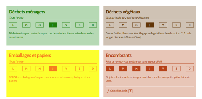 3. Déchets verts : à partir du 2 avril jusqu'au 11 décembre 2026 Bacs marrons, plus de sacs, 1 fois /semaine : le jeudi